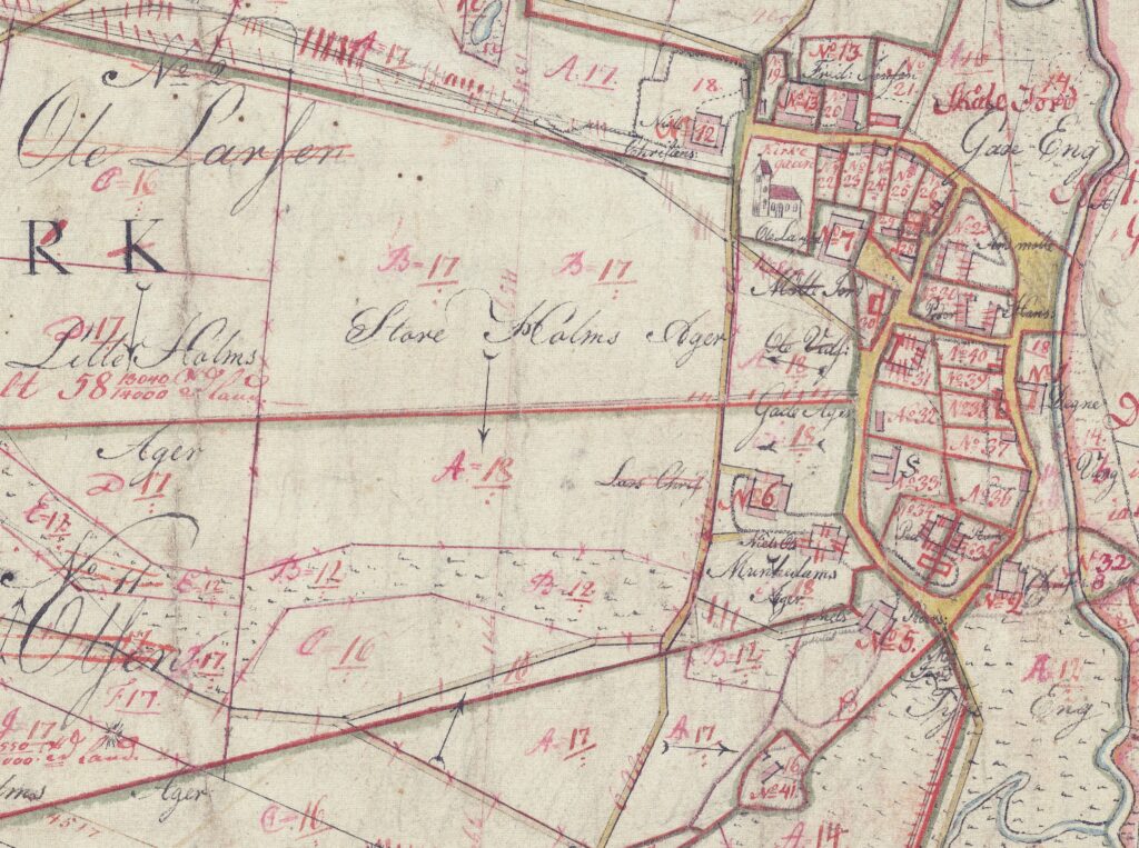 Kortet er matrikelkort fra 1808 til 1852. Bygården er Nr 7 og fæstebonden hed i 1808 Ole Larsen. Gårdens jord ligger vest for gården (tv.) Kortet viser også hvorledes jorderne blev udskiftet og meget mere. Mere om det en anden gang.